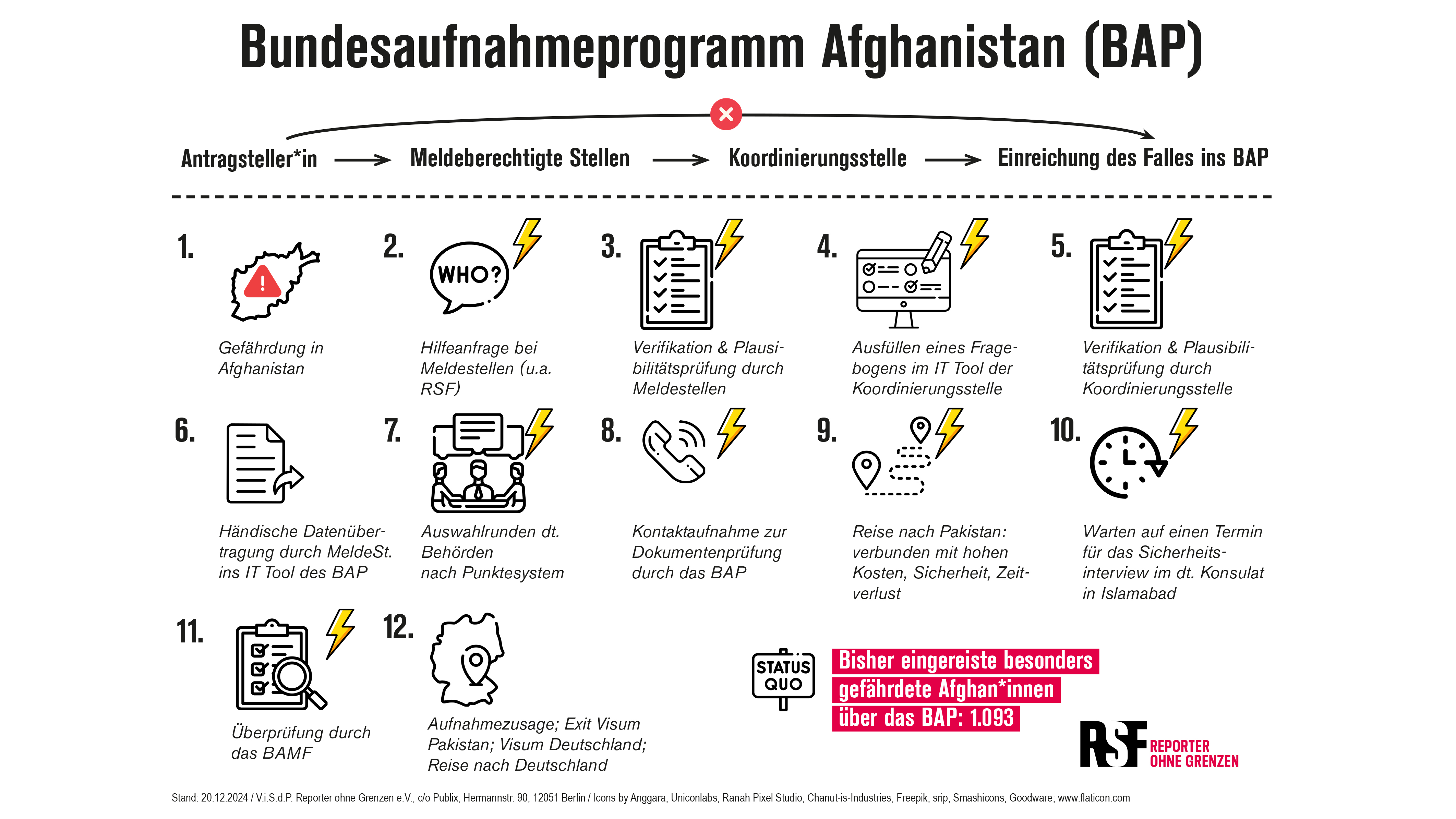RSF hat von Beginn an über das BAP informiert und die Schwachstellen bemängelt: intransparente Aufnahmekriterien, komplizierte Abläufe und Zahlen, die weit hinter den versprochenen 1.000 Aufnahmen pro Monat lagen. RSF hat wiederholt Verbesserungen vorgeschlagen. Doch aus Sicht der Organisation hat die Bundesregierung auf die Kritik nicht angemessen reagiert.